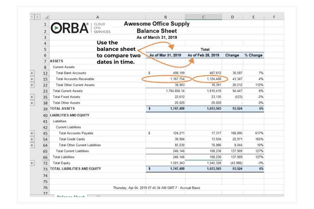 The balance sheet is good for comparisons and understanding company value. It’s often required by lenders to obtain a loan or when you wish to apply for a business line of credit. The balance sheet report provides business financial health check ratios like the acid test or debt-to-equity ratio and tells an important story about your financials. More relevant than the compliance need, these metrics help identify trends so you can adjust operations as needed to “balance” your risk and return. Your balance sheet shows how effectively your business is turning its profits into cash. If you aren’t regularly reviewing your balance sheet our outsourced controller services may be the solution.
